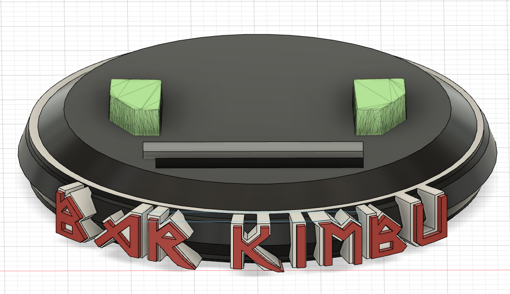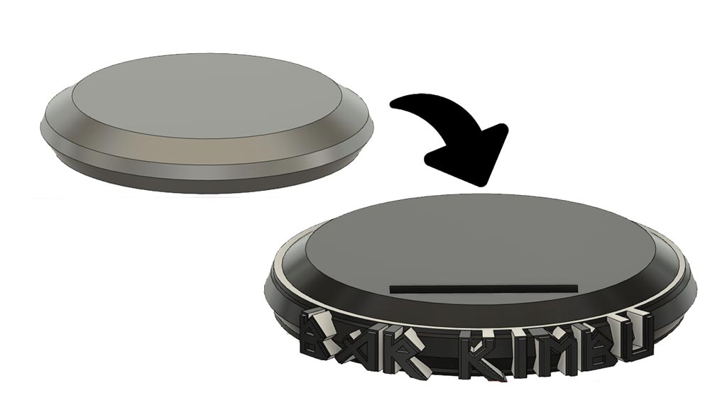 Para la creación de la base, se crearon dos bases circularres en la misma posición y en una de ellas se grabó el nombre en relieve con la tipografía de Iron Maiden (si no la tenéis, aquí os la dejo), utilizando la opción Repujado de Fusion 360.