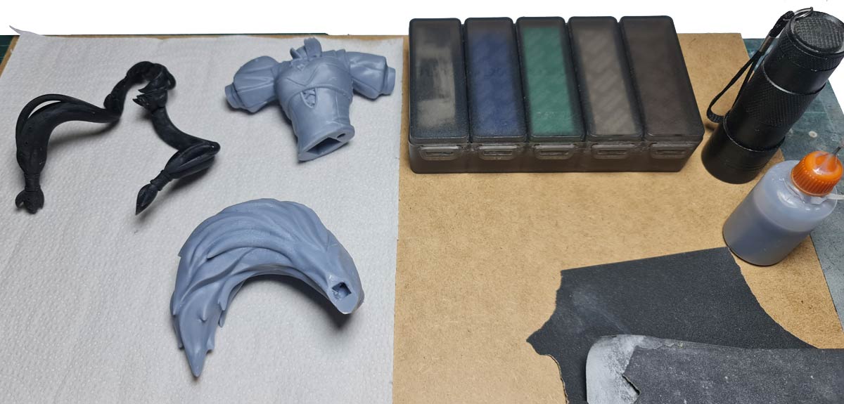 Una vez impresas las piezas y ya limpiadas y curadas, es necesario prepararlas para pintura, para ello, te aconsejo utilizar una lija de 900 y agua, esto hará que la imprimación se adhiera mucho mejor y corregirá imperfecciones en las piezas. Además, al utilizar cinta de enmascarar, evitarás que la pintura se levante.