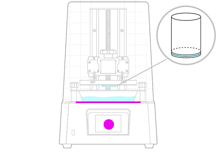 3- La pantalla proyectaría un círculo utilizando luz UV durante 2 segundos provocando que la resina se endurezca.